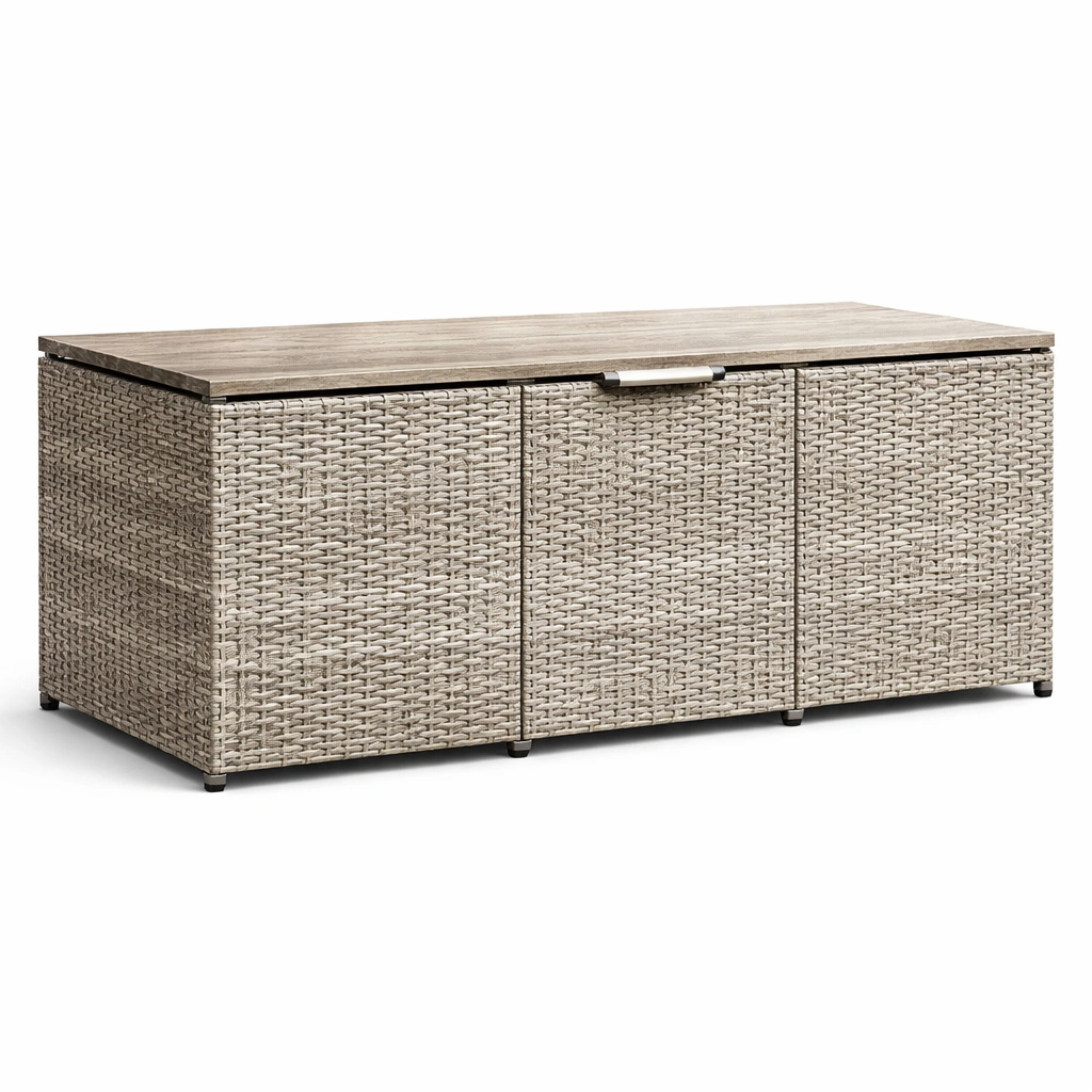 Arcón de almacenamiento para jardín de resina trenzada gris con tapa de madera
