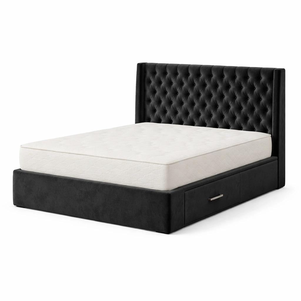 Material: Estructura de madera tapizada en terciopelo negro, cajones de MDF con tiradores de metal.